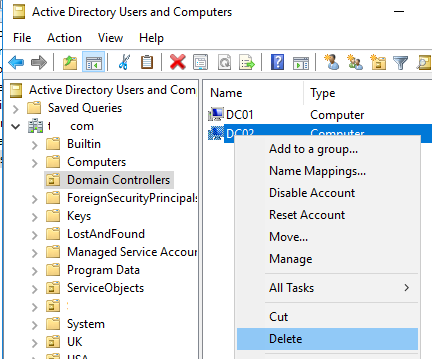 To do this, just find the failed DC in the ADUC console and delete it as a regular computer object. Right-click on it, select Delete, and confirm the deletion.