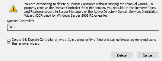 In the next dialog box, check the item “This Domain Controller is permanently offline and can no longer be demoted using the Active Directory Domain Services Installation Wizard (DCPromo)”, and click Delete button.