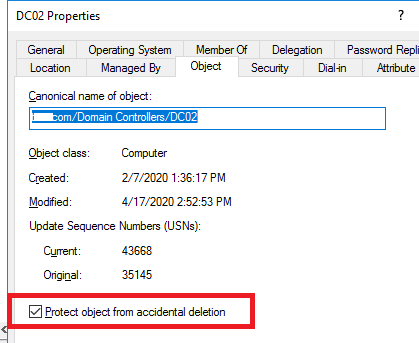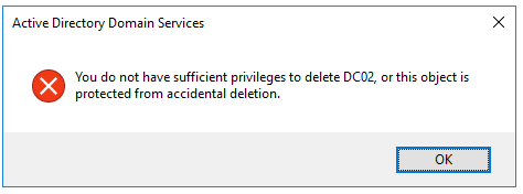 Hint. If the following error appears when you try to remove a DC “You do not have sufficient privileges to delete DC02, or this object is protected from accidental deletion”, please make sure: