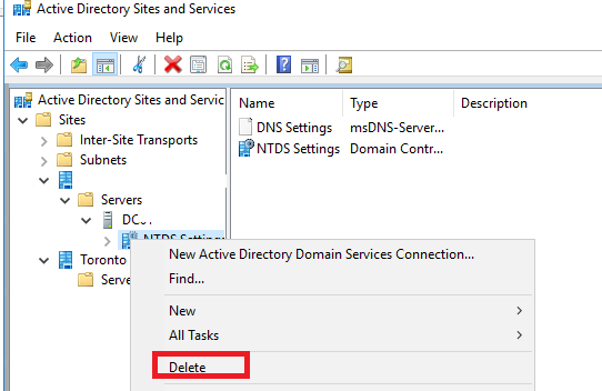 Then you need to open the Active Directory Sites and Services snap-in (dssite.msc) and delete the corresponding NTDS Settings object (expand the domain controller site, which forcibly removed, expand Servers > expand the DC name, right click on the NTDS Settings object > Delete ). Confirm the deletion of the object.