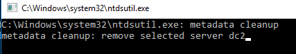 If for some reason your controller fails and it is not planned to return it, you can perform forced removal of the failed domain controller. This procedure is called Metadata cleanup. When you perform metadata cleanup, you will delete all data about the failed DC from Active Directory Domain Services (AD DS). This correctly cleans replication metadata, including the objects in File Replication Service (FRS) and Distributed File System (DFS).